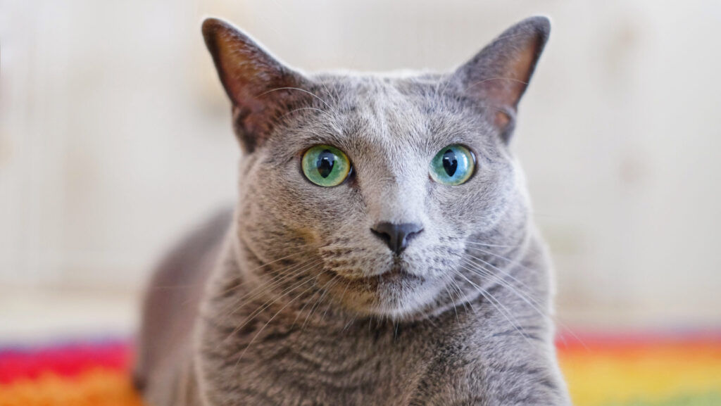 ロシアンブルーの外見的な魅力を決定づけているのは、鮮やかなエメラルドグリーンの瞳と、光沢のあるブルーの被毛です。